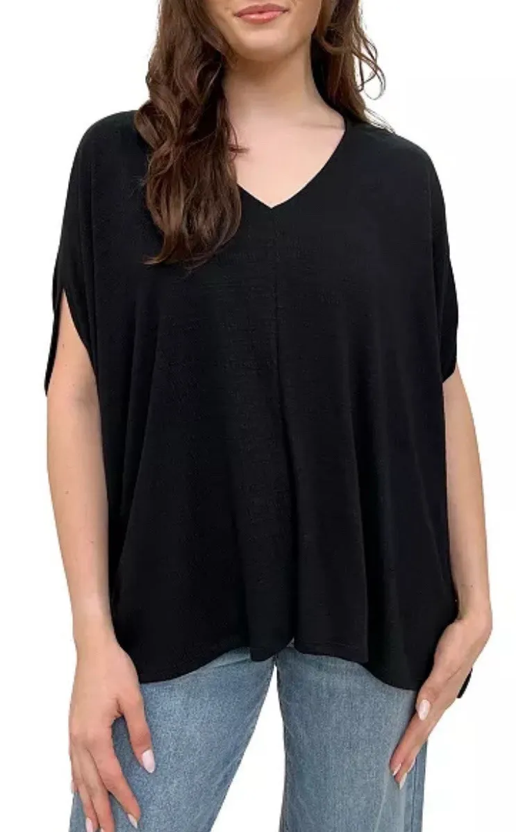 This is a Laurie Felt women's blouse in size 2XL with an oversized fit, designed in a black knit fabric. The top features a V-neckline, providing a stylish and comfortable look. Perfect for casual or semi-formal wear, this oversized blouse offers a relaxed and chic style for plus-size women.