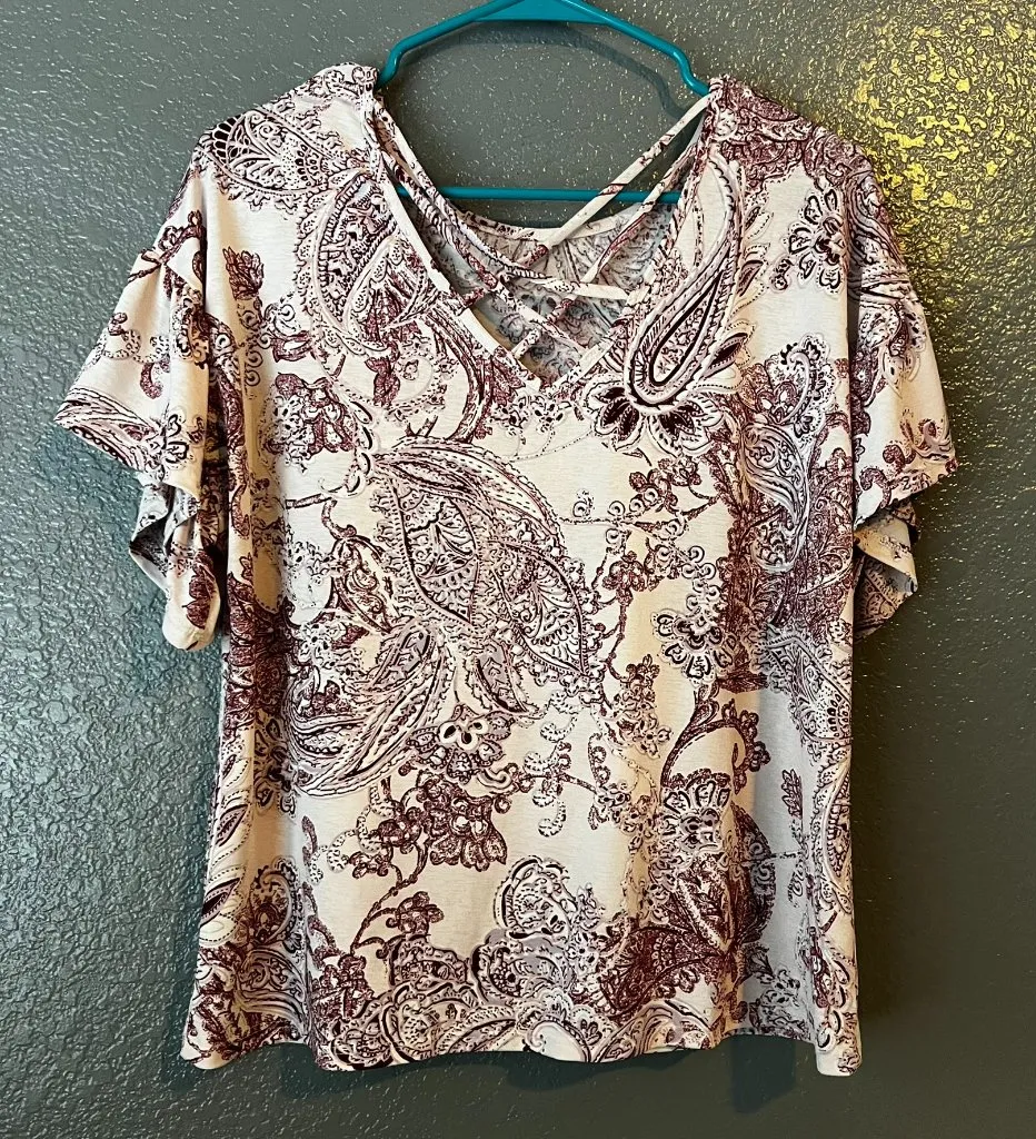 Stylish paisley print top with short sleeves and a flattering criss-cross v-neckline. Lightweight, stretchy, and comfortable with a relaxed fit. Great for casual wear, layering, or pairing with jeans and skirts. #PaisleyTop #VNeckBlouse #BohoStyle #CasualChic #EverydayWear