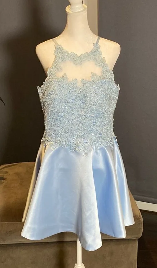 Women’s Pale Blue Halter Neck Prom or Party Dress. This dress has some sparkle in the light when you move which looks really pretty. Bodice is lace appliqué and skirt is satin. Another great feature is this dress has hidden pockets! Awesome for keeping a few things with you when you are not wanting to carry a purse (see picture). Size 12 approximately, see pictures for approximate lay flat measurements. This dress is approximately 33” long from shoulder to hem (see listing pictures) *Color may vary based on lighting and device used to view this item *Color may vary based on lighting and device used to view this item