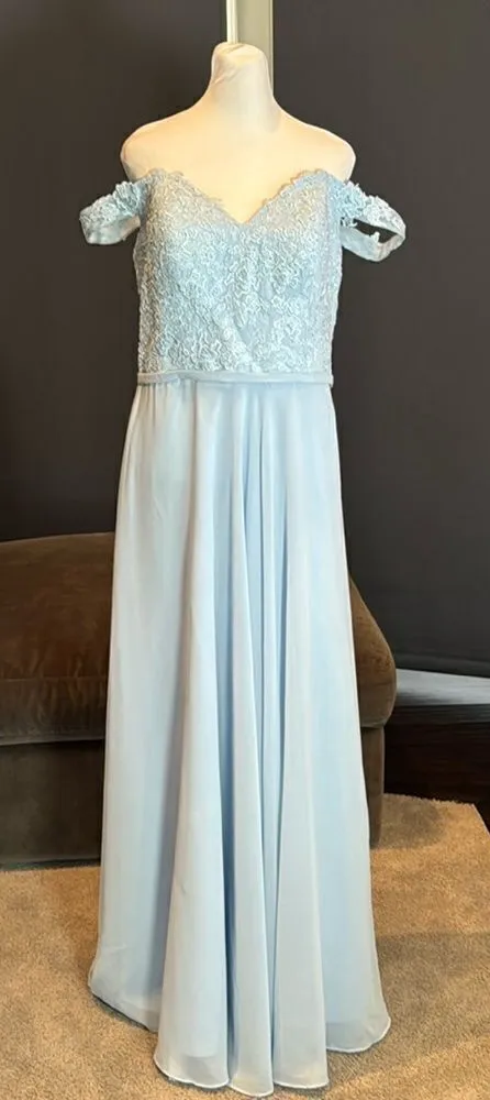 Women’s Pale Blue Off the Shoulder Chiffon Bridesmaid Dress with Corset Back and Long Front Leg Slit that has lots of material Behind it so your legs do not show, more for pretty detail Beautiful Dress for all Formal Occasions - Mother of the Bride, Mother of the Groom, Party, Birthday, Celebration, Wedding Guest, Bridesmaid or Special Event! Size 16 - please see pictures for approximate lay flat measurements. As this dress has a corset back there is room for size adjustment/fluctuation which is nice. The back panel is quite wide (see picture) and ties long so room to go larger. I have it quite tightly laced in my pictures The back bodice is sheer (see picture) as so you can see my hand through, but the front of the bodice is not see through. Built in bra cups NWOT *Color is subjective and may vary based on lighting and device used to view this item 1314B177