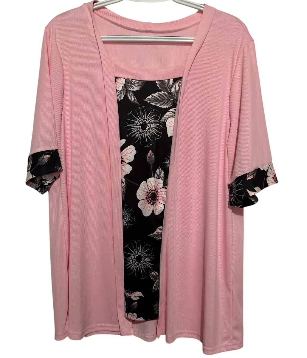 Women's Pink Black Gray Floral‎ Short Sleeve Ribbed Blouse Size 1XL - $7 - From Bonnie