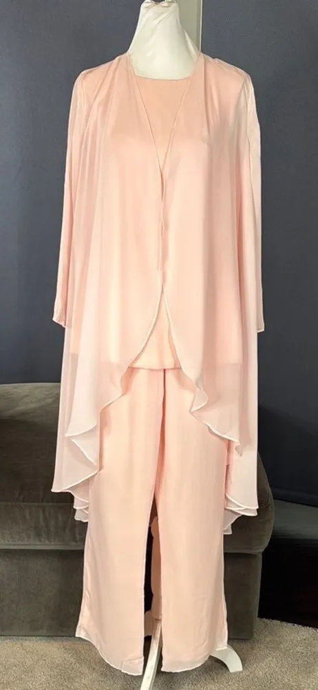 Women’s Pink Chiffon 3 Piece Formal Pant Suit Set Chic three-piece set in a soft pink hue. Features a flowing Chiffon Jacket, Top and matching Pants. Beautiful Set for all Formal Occasions - Mother of the Bride, Mother of the Groom, Party, Birthday, Celebration, Wedding Guest, Bridesmaid or Special Event! Size 4 - please see pictures for approximate lay flat measurements. The pants have an elastic waist so stretch further than the lay flat measurement shows. Waist stretches to 28” comfortably Chiffon jacket is sheer NWT - Brand New with Tags! *Color is subjective and may vary based on lighting and device used to view this item *Formalwear does not always fit like regular clothing, please look at the actual measurements provided to make sure this will fit you 2577B173
