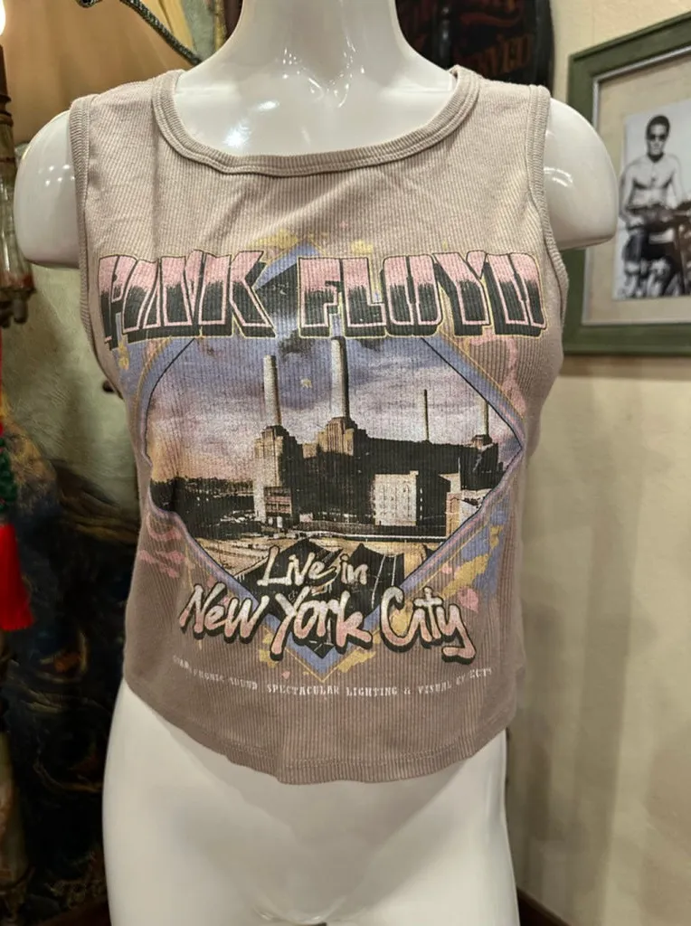 This is a women's beige ribbed tank top featuring a "Pink Floyd Live in New York City" graphic print... Show more