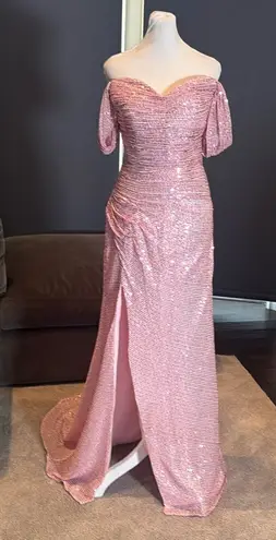 Women’s Pink Fully Sequined Off the Shoulder Dress with a Leg Slit and Zip Up Back. This dress is really pretty and sparkles in the light as you move around Beautiful Dress for all Formal Occasions - Prom, Party, Homecoming, Birthday, Celebration, Wedding Guest, Bridesmaid or Special Event! Size 2 - please see pictures for approximate lay flat measurements. Built in Bra Cups Small Train As my dress form doesn’t have arms it is hard to show how the off the shoulder looks, but the material drapes off the arm. *Color is subjective and may vary based on lighting and device used to view this item 1750B201