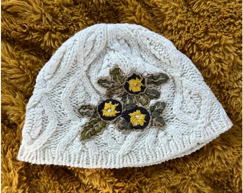 This is an off-white prAna cable knit beanie, featuring a floral embroidery design on the front. The... Show more