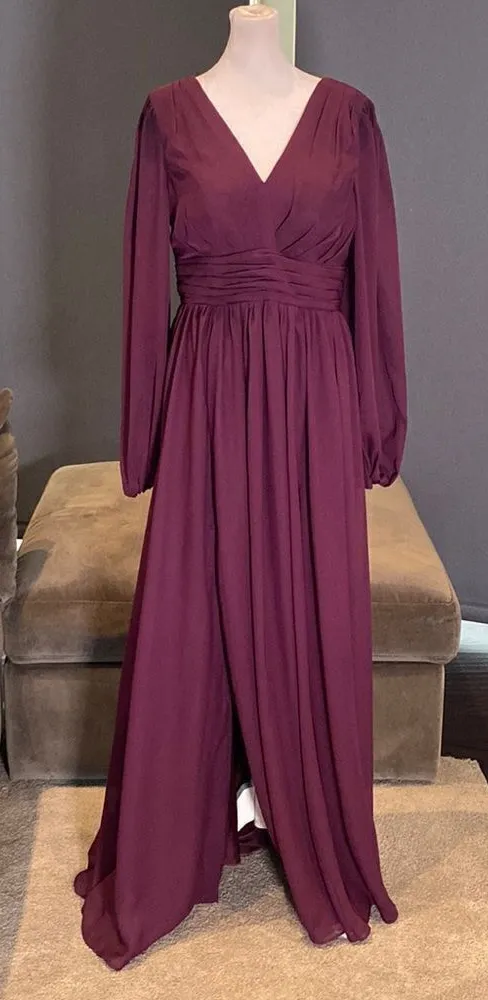 Women’s Purple Chiffon Full Length Dress with a Corset Back and a Leg Slit Great as a Bridesmaid dress, Wedding Guest, Mother of the Bride, Mother of the Groom, Party, Formal or Special Occasion Size M - please see pictures for approximate lay flat measurements. As the back is corset style there is some room for size adjustment/fluctuation which is nice. Has built in bra cups, Long Sheer Sleeves and a V-Neck *Color may vary based on lighting and device used to view this item 0527B82