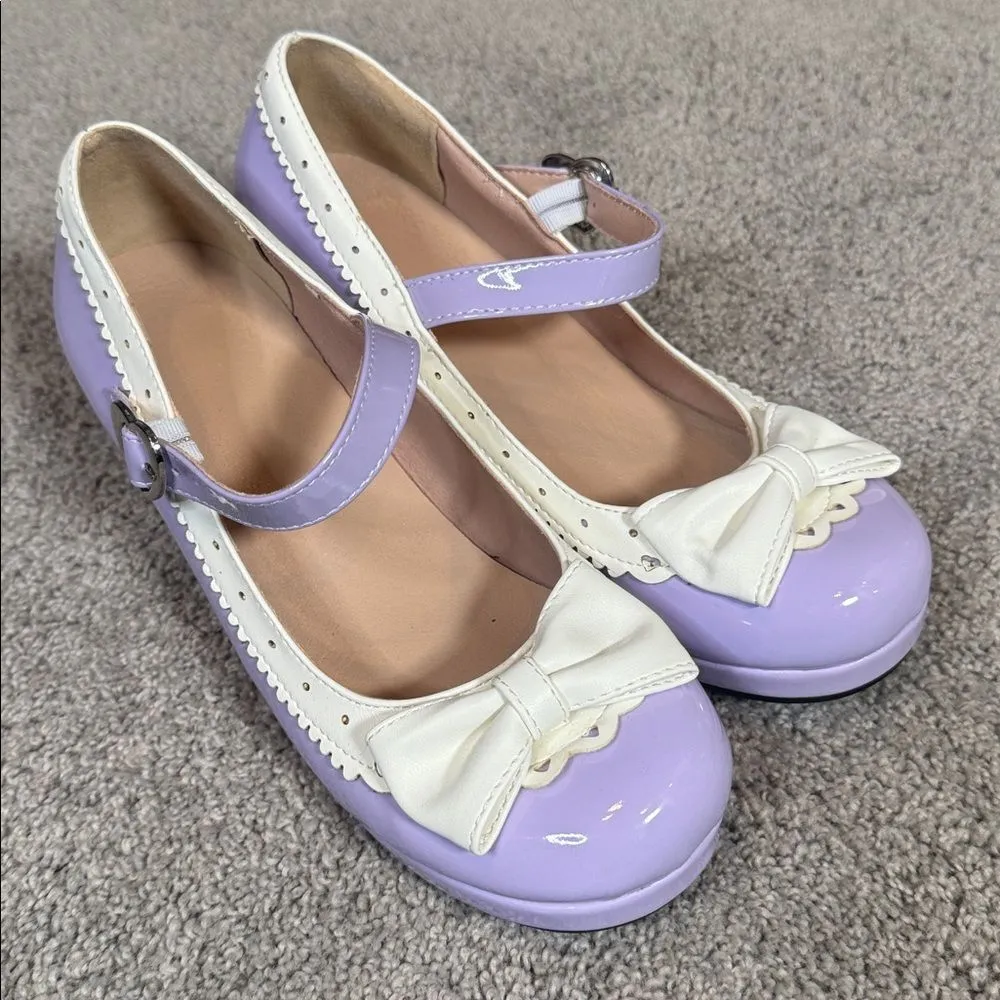 Women’s Purple Patent Chunky Heel Mary Jane Pumps These shoes have a cute bow on the front and sweet heart shaped buckle. Round Toe with mid height chunky heel. Great for Cosplay, a cute Lolita shoe. As you can see from the soles on these shoes they are basically brand new! They have been tried on, but not worn out - soles are in excellent condition. Size 7 - 38 on the sole equates to a U.S. 7 (see included size chart) *Color may vary based on lighting and device used to view this item 2812B70