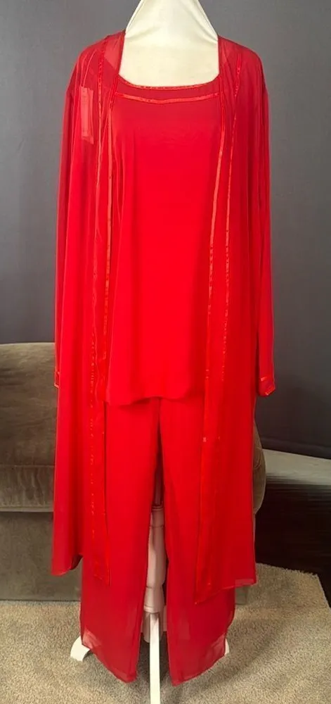 Women’s Red Chiffon 3 Piece Pants Suit Beautiful Pant Suit for all Formal Occasions - Mother of the Bride, Mother of the Groom, Party, Birthday, Celebration, Wedding Guest, Bridesmaid or Special Event! This gorgeous set comes with Top, Pants and Jacket. There is some Ribbon detail on the top and edge of the jacket. The Long Flowing Jacket is sheer. Top Zips Up on the side (see picture) The pants have an elasticized waist so they stretch wider than the lay flat measurement, would comfortably stretch to a 41” waist Size 20W - please see pictures for approximate lay flat measurements. *Formalwear does not always fit like regular clothing, please look at the actual measurements provided to make sure this will fit you NEW with Tags *Color is subjective and may vary based on lighting and device used to view this item 2475B179