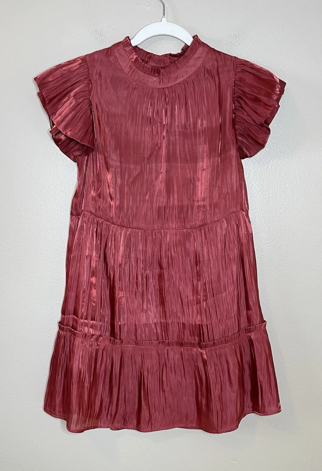 The perfect holiday or event dress -shimmer/shinny fabric that catches the light subtly -tiered -flutter sleeve -key hole back In excellent used condition, no flaws found Women's size S Measurements are approximate & taken while item was laid flat: Chest: 17.5" Waist:17.75" Hips: 22" Length: 32" Please let me know if you have any questions!