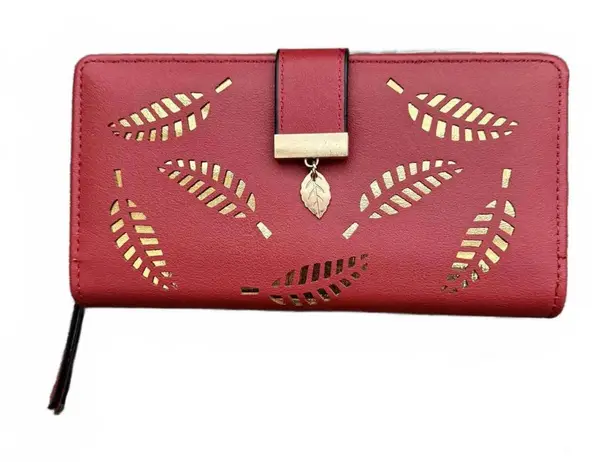 SKU: #O153 Brand: Unbranded Item: Envelope Long Wallet Condition: Brand New Without Tags Color: Red Gold Print: Solid with Front Cutout Leaves Material: Synthetic Leather Description: Front Snap, ID Holder, Credit Card Slots, Zippered Pocket for Bills and Coins Measurements are approximate: Length (Left to Right) – 7.5” Width – 1” Height: 4”