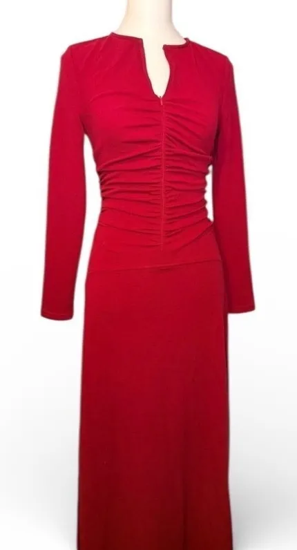 Turn heads in this striking red midi dress, designed to flatter your silhouette with its captivating ruching detail. The long sleeves offer a touch of sophistication, while the form-fitting design accentuates your curves for a confident and glamorous look. The elegant neckline adds a subtle allure, making this dress perfect for making a memorable entrance. Imagine the compliments you'll receive at a wedding reception or a formal dinner. Style: Bodycon, Maxi Dress Length: Long Department: Women Sleeve Length: Long Sleeve Pattern: Solid Occasion: Party/Cocktail Material: Polyester Fabric Type: Knit Theme: Designer Season: Spring, Fall Sleeve Type: Raglan Sleeve Keywords: red dress, long sleeve dress, ruched dress, bodycon dress, maxi dress, elegant dress, evening dress, party dress, cocktail dress, formal dress, women's fashion, special occasion dress, holidays