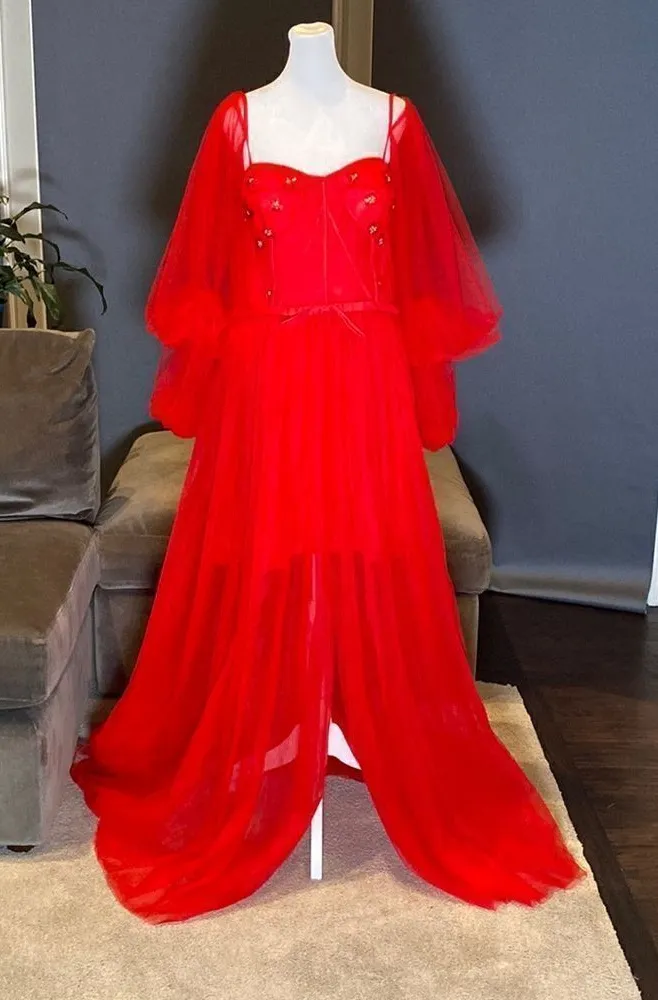 Women’s Red Prom Party Formal Dress With Corset Back and Leg Slit. This dress has see through areas. The front bodice is sheer except for the bust/bra cups. The lower area is also sheer, but there is a short skirt underneath. The arms are sheer too. Size 16 - Lay flat approximate measurements in pictures. This dress has a corset/lace up back which allows for some fluctuation/adjustment in sizing. A really unique and beautiful dress! NWOT but has been tried on *Color may vary based on lighting and device used to view this item 0293B002