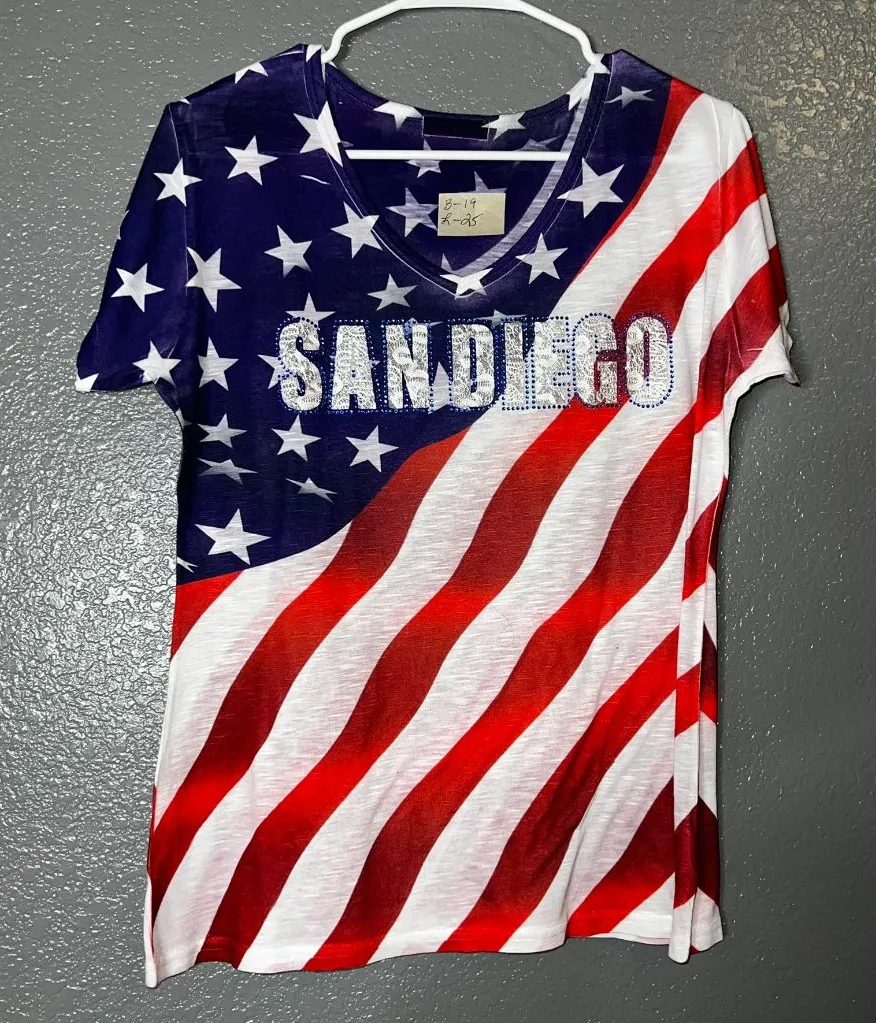 P2P: 19" Length: 25" Materials: Not listed (lightweight stretch knit) Notes: Patriotic San Diego graphic tee featuring an allover USA flag print with sparkling rhinestone lettering. Lightweight, soft, and perfect for summer, vacations, 4th of July, or casual everyday wear. V-neck style with a flattering, comfortable fit. #PatrioticShirt #SanDiego #USAFlagShirt #WomensTShirt #FourthOfJuly