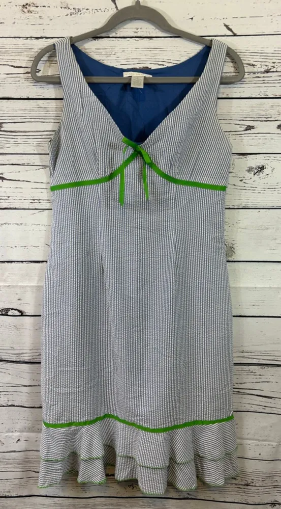 This is a pre-owned Sarah Spencer seersucker mini dress in size 4, featuring a white and blue striped pattern. The dress has a V-neckline with a green ribbon bow detail and a green trim accentuating the empire waist. The hemline is adorned with a ruffled tier, also edged with green trim. The interior lining is a solid blue. The fabric content tag indicates a shell of 58% cotton and 42% polyester, with a 100% cotton lining.