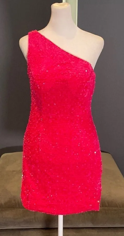 Women’s Sequined One Shoulder Short Pink Dress great for Parties, Prom or Special Events Size 4 - see pictures for approximate lay flat measurements. The material is stretchy so there is room to go a little larger. *Color may vary based on lighting and device used to view this item 0361B58