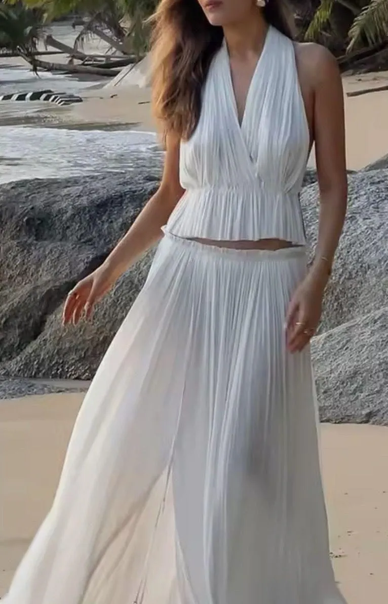 Women’s Sexy Gauze Halter Pleated Set Cute for the beach. Size small. Fits small to medium best Slight see through top material **Second photo is a review of it on someone else ***1st photo is stock photo. Model added a belt. I am too tall for this set and it doesn’t work for me, which is upsetting. Looks cute and just like the second photo of the review. Color is White, not the sunset filtered (2nd photo) stock photo.