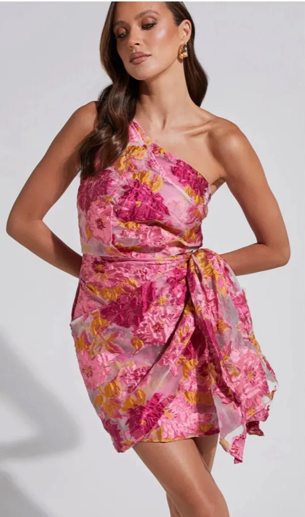 This Showpo one-shoulder dress, size AU 4 | UK 4 | US 0 | EU 32, features a vibrant pink and gold fl... Show more