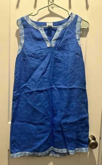 Add a touch of classic style to your wardrobe with this beautiful blue linen sleeveless tunic dress from Sigrid Olsen. The A-line dress features an asymmetrical sleeve design and a collarless neckline, making it perfect for casual summer and spring occasions. The dress is made from high-quality woven linen material and is easy to wear with a pullover closure. This dress is a size small and is suitable for regular size types. It has a short dress length and is perfect for those who love solid patterns and classic themes. Made in China, this dress is a must-have for any fashion-forward woman who wants to look her best.