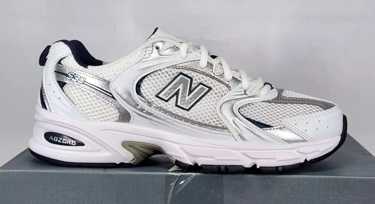 New with original box Women's size 5.5/Mens size 4 New Balance 530 white blue silver