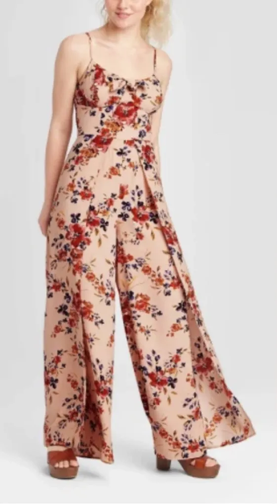 Chic floral jumpsuit by Xhilaration. Features vibrant red and cream floral patterns. Ideal for styli... Show more