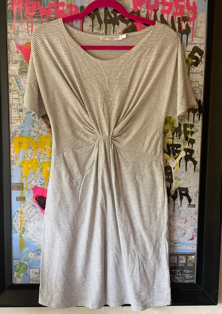 Sarah Liller short sleeve super soft jersey grey and white stripe above the knee dress. Size small. Twist at waist for a defined shape. Super soft and stretchy jersey knit. Hidden pockets at hips. No signs of wear, stains, or damage. Shoulder to hem: 33.5" Pit to pit: 15" Measured flat. From a smoke and dog-free home.