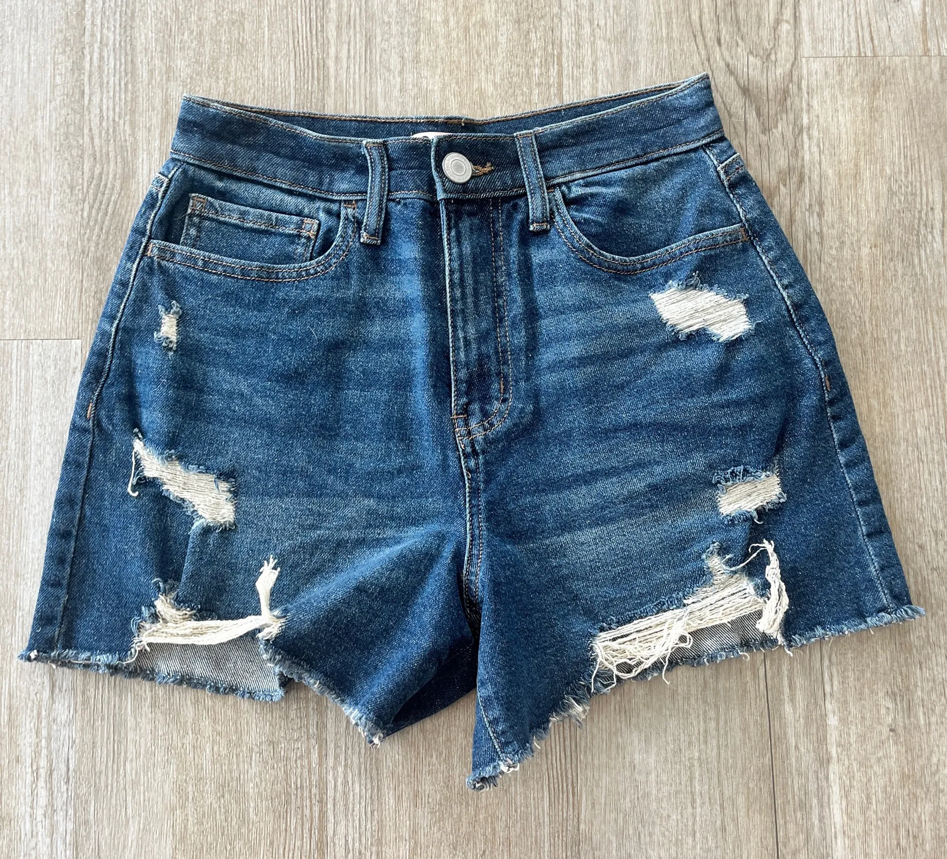 Womens size 5 / 27W SO Super High Rise 90s Boyfriend Short jean shorts Dark denim Distressing 2 front pockets, 2 back pockets Zipper and button closure Waist is 13 inches across 12 inch rise 4 inch inseam 99% cotton, 1% spandex Smoke free home Womens size 5 / 27W SO Super High Rise 90s Boyfriend Short jean shorts Dark denim Distressing 2 front pockets, 2 back pockets Zipper and button closure Waist is 13 inches across 12 inch rise 4 inch inseam 99% cotton, 1% spandex Smoke free home