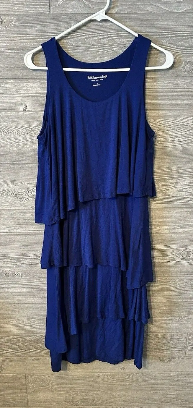 This beautiful knee-length dress from Soft Surroundings is perfect for any summer occasion. The dress features a sleeveless design with a tank style, and is layered with tiers for added texture. The dress comes in a lovely shade of blue and is made of high-quality materials for comfortable wear. The dress is available in size small and is suitable for regular size types. It is perfect for women who want to look stylish and elegant. The dress is made in China and is not vintage. It is ideal for those who love modern designs.