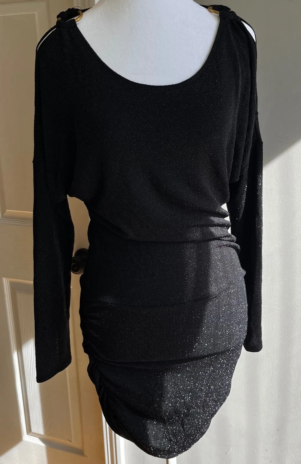 Excellent Condition no material or size tag measures 18 pit to pit 32 long has some stretch Glimmering sophistication radiates from this elegant, long-sleeved dress, designed to make a lasting impression. The dress boasts a refined silhouette, enhanced by subtle ruching that accentuates the figure with grace. Keywords: cocktail dress, party dress, evening dress, long sleeve dress, black dress, sparkly dress, ruched dress, elegant dress, formal dress, glitter dress, little black dress, special occasion dress Thanks for Looking!