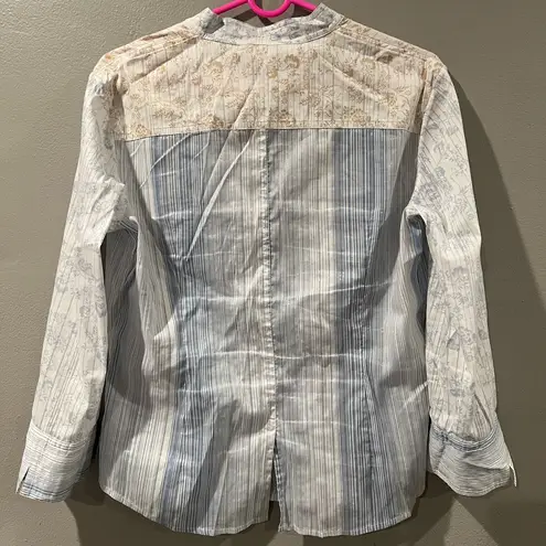 Stylish striped button-up blouse with long sleeves. Features a mix of blue and cream colors. Lightweight, mixed print. Popover style. Button front detail. 3/4 sleeve. Cotton blend.