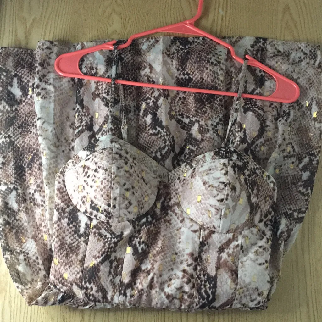 Womens Super Sexy Sparkly Snake Skin Print Dress Adjustable straps Lightly padded soft molded cups Stretchy Soft and Comfy Color: Rose Gold tan brown gold off white Size Small Should fit some medium Good condition