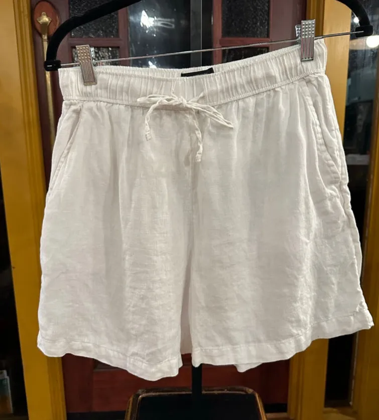 These are women's Tahari white linen shorts, size S, made in Cambodia. The shorts feature an elastic... Show more