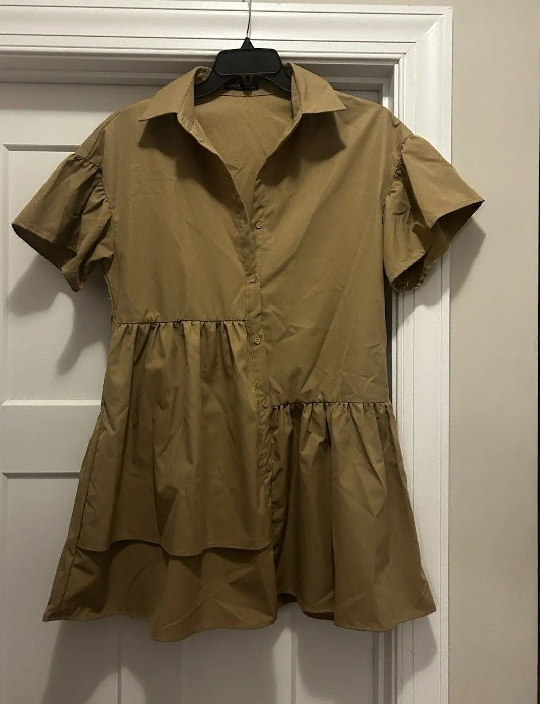This Women's Tan Khaki Utility Mini Dress in size 6 is a stylish and versatile piece perfect for various occasions. The dress features an asymmetrical ruffle detail, adding a trendy touch to its classic design. Made of polyester fabric, this V-neck dress with puff sleeves and a button closure is ideal for travel, casual outings, or outdoor adventures in the warmer seasons. The solid brown color and nature-inspired theme make it a fabulous choice for those looking for a chic and comfortable option for their wardrobe.