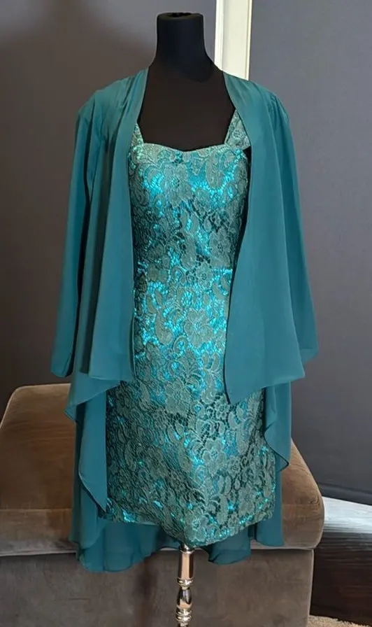 Women’s Tea Length Green Dress with a Corset Back and Matching Chiffon Jacket This dress is perfect for a Mother of the Bride, Mother of the Groom, Wedding Guest, Graduation, Party, Work Function, Formal or Special Event Beautiful eye catching color! Size 8 - please see pictures for approximate lay flat measurements. As the back is corset/lace up style there is room for size fluctuation/adjustment which is nice. I have it quit tightly laced in these pictures NWOT but has been tried on This dress is approximately 38 inches long from Shoulder to hem *Color is subjective and may vary based on lighting and device used to view this item 1183B167