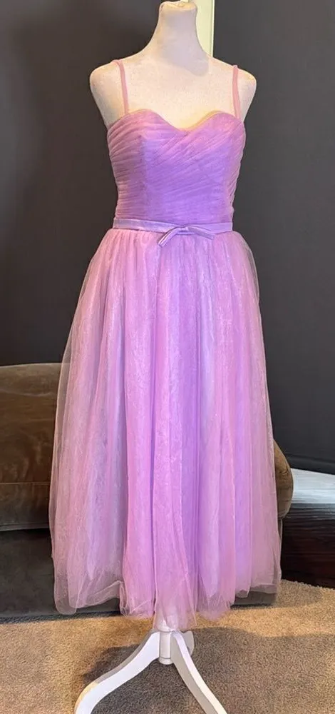 Women’s Tea Length Purple Dress with a Corset Back and Sweetheart Neckline Beautiful Dress for all Formal Occasions - Prom, Party, Homecoming, Wedding Guest, Bridesmaid or Special Event! Size 4 - please see pictures for approximate lay flat measurements. As the back is corset/lace up style there is room for some size fluctuation/adjustment which is nice. The back panel is quite wide and corset ties quite long so room to go wider than I have the dress laced in my pictures. This dress also has Pockets in the tulle, that are handy, but if you put things in there you would see the items :) so not sure if this is a feature you would use! Approximately 48” long from shoulder to hem NWOT but has been tried on *Color is subjective and may vary based on lighting and device used to view this item 1245B173