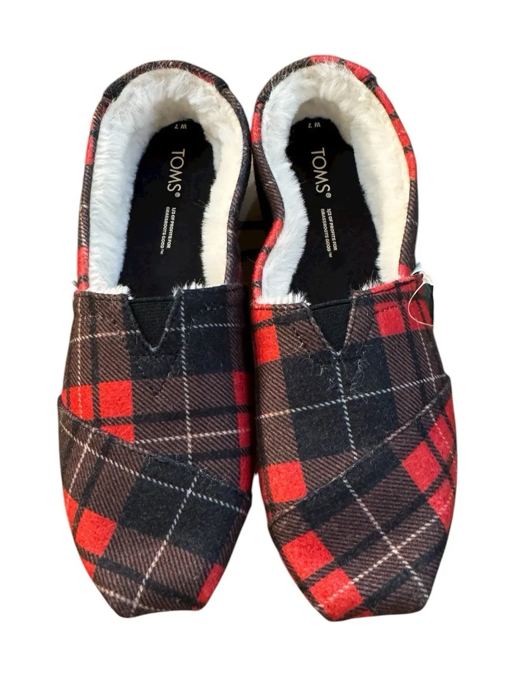 The Women's Toms Shoes Buffalo Plaid Slip-on Flats in Red/Black, Size 7, are a stylish and comfortab... Show more