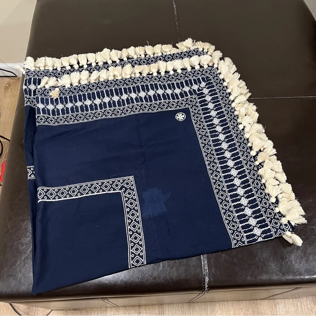 Womens Tory Burch Navy Pom Pom Fringed embroidered Scarf/Wrap 20X40 B2