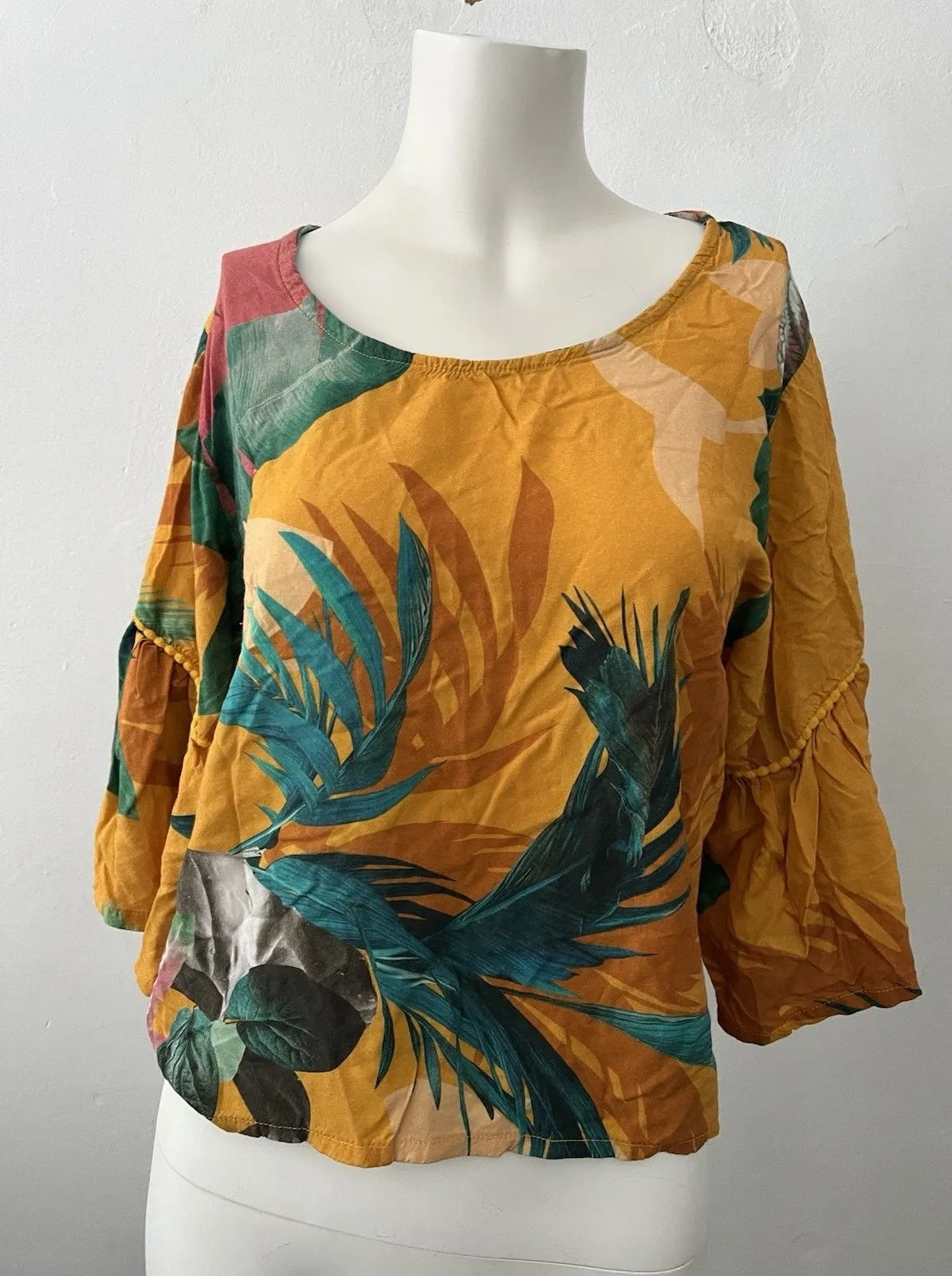 * Womens Tropical Flared Sleeves Tunic Small Pom Pom Resort Flower Beach Brazil * Designer Nathalia Otero * Bright mustard tropical floral print pattern * Pom pom detail in the middle of the sleeve * Flared sleeves * Lightweight breathable for all seasons * No size or material tag but feels like viscose * See pics for measurements