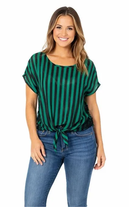 This pre-owned Ultra Flirt women's short-sleeve top in size Medium features green and black vertical stripes. The front has a tie-knot detail at the hem, while the back incorporates black floral lace across the shoulders and upper back. The fabric appears sheer, and the care tag indicates it is made of 100% polyester with lace composed of 92% nylon and 8% spandex. Measurements show a width of approximately 17.5 inches across the bottom and about 23.5 inches around the tied waist. 427