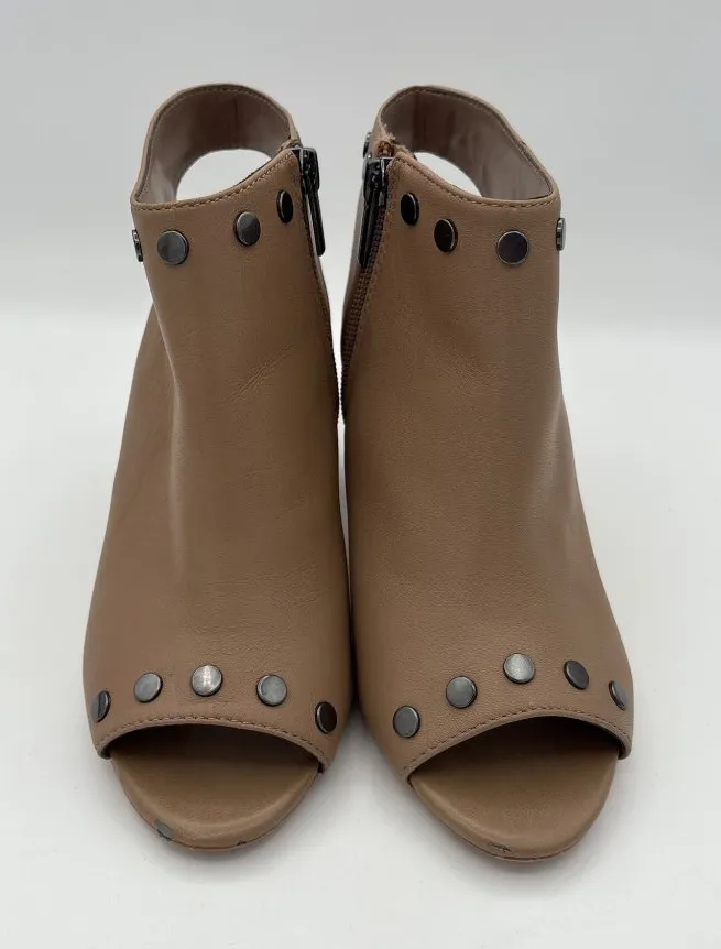 Elegant taupe block heels with chic heel and toe exposure, featuring silver hardware. Perfect for ad... Show more