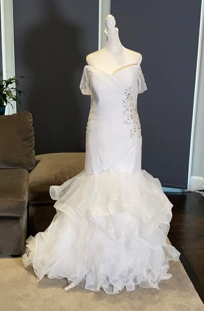 Women’s Wedding Dress with Beautiful Side Design, Ruffles and Corset Back Size 10 approximately - please see pictures for approximate lay flat measurements. I think there is a little more room in the bust area, the back is a corset/lace up design which means there is some room for size adjustment/fluctuation This dress is NWOT but has been tried on. *Color may vary based on lighting and device used to view this item
