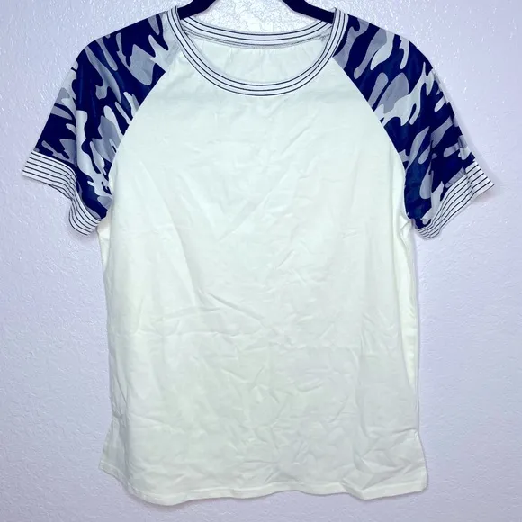Brand New! Unbranded Size: Medium (see photos for measurements) Color: White with Gray & Blue Camo Material: 65% Cotton, 35% Polyester Sleeves and neckline are outlined with 5 Blue Stripes Sleeves have Gray & Blue Camo Pattern Dry Clean Only B25