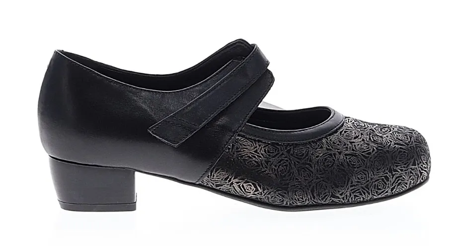 Stylish black Mary Jane shoes with embossed floral design. Perfect for any occasion. Womens Wide Fi... Show more