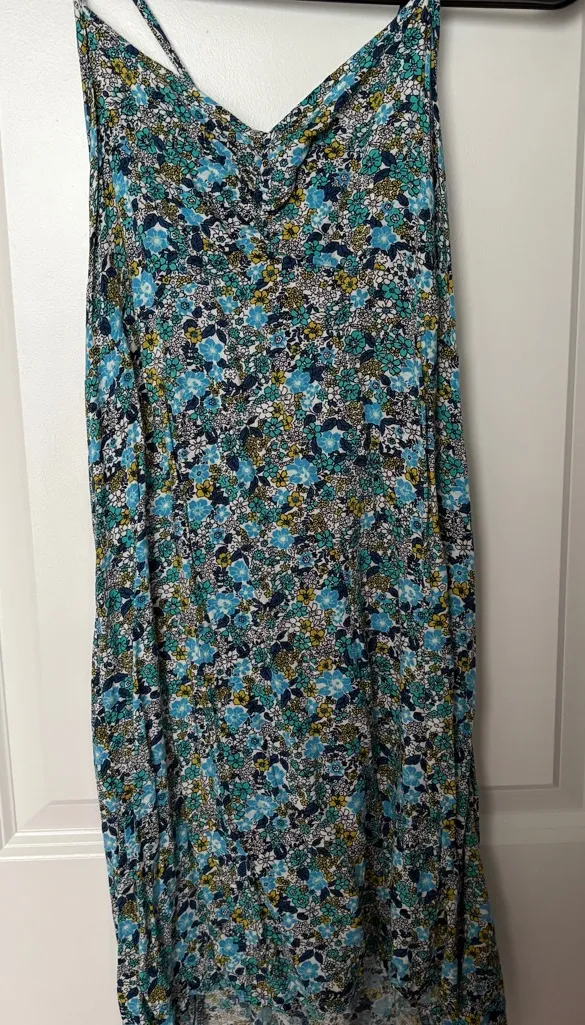 Chic high low dress with floral design. Features vibrant blue and green hues. Perfect for casual out... Show more
