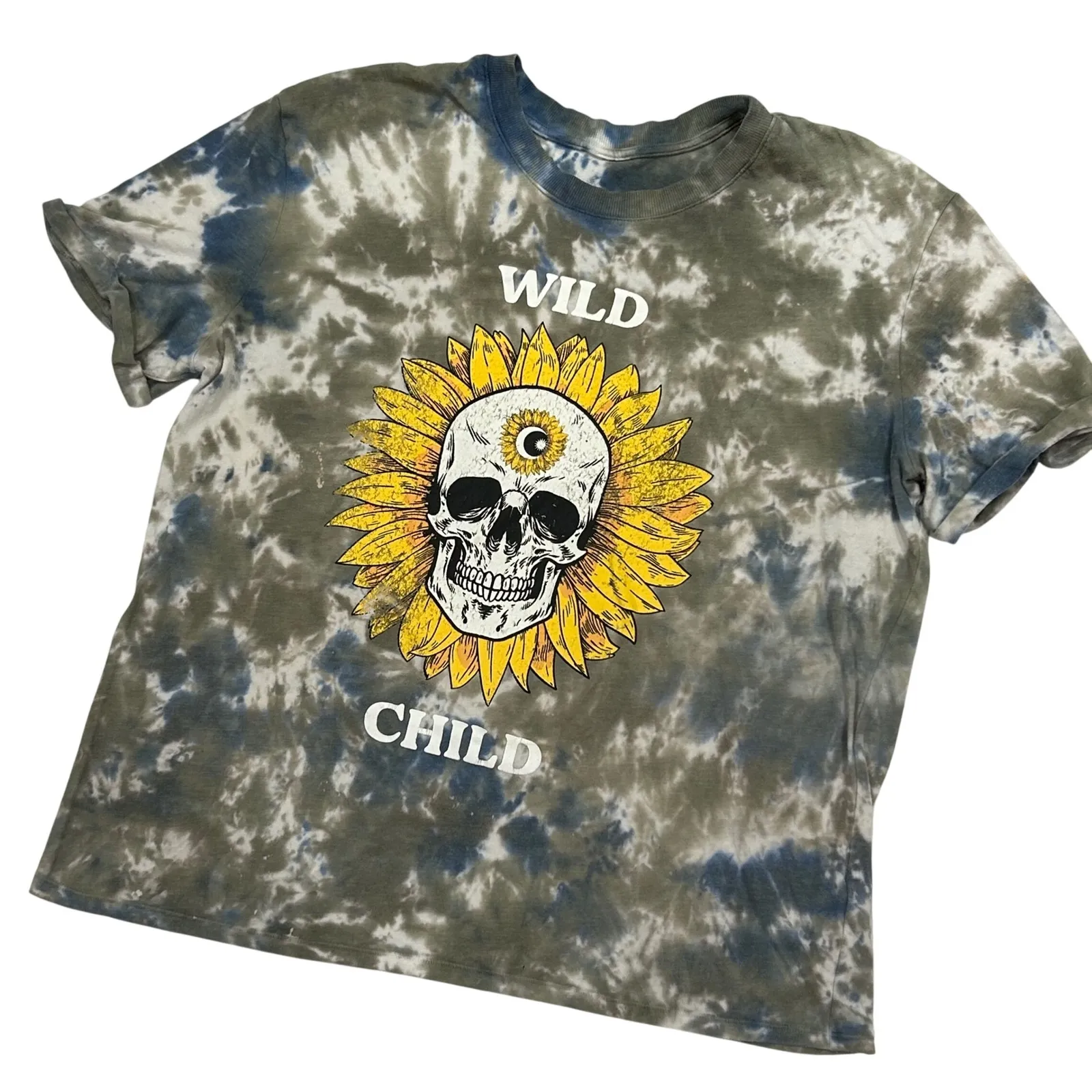 Embrace your inner rebel with this captivating graphic tee! An edgy skull emerges from a vibrant sunflower, crowned with a third eye symbol. This juxtaposition creates a mesmerizing focal point on a tie-dye canvas of khaki and blue hues, making this top a standout piece. Perfect for adding a touch of alternative flair to casual outings, music festivals, or laid-back days with friends. No collar brand tag. Thin/moderate pilling. Measurements: • Pit to pit: 25 inches • Length: 27 inches Type: T-Shirt Department: Women Style: Basic Material: Cotton Blend Neckline: Crew Neck Sleeve Length: Short Sleeve Sleeve Type: Casual Sleeve Theme: Skull, Flower, Grunge, Festival, Boho Fit: Regular Keywords: tie dye shirt, graphic tee, skull t-shirt, sunflower shirt, wild child tee, womens t-shirt, xxxl shirt, plus size tee, alternative fashion, casual top, festival clothing, boho style, grunge shirt, indie clothing