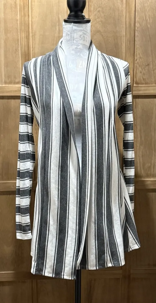 Women's Ya Los Angeles long open cardigan/kimono. Stylish gray & white striped long sleeve top for women. Perfect for casual outings or office wear. Good used condition. Approximate measurements: Length: 31" Armpit to armpit: 18"