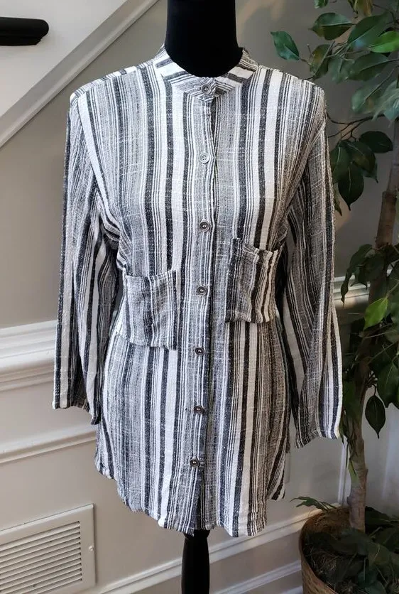 This chic women's shirt by Zara features a trendy striped pattern in black and white. The top is made of a comfortable blend of 80% rayon and 20% linen, making it lightweight and breathable—ideal for warmer weather. It has a button-front closure and two front pockets, adding a casual yet stylish touch to any outfit. The shirt is in a medium size and is perfect for layering or wearing on its own. Pair it with jeans or skirts for a laid-back, fashionable look. Made in the USA. Easy to care for with hand wash instructions. Brand: Zara Tapestry Size: Medium Color: Black and white stripes Material: 80% Rayon, 20% Linen
