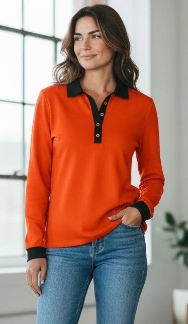 Sport a vibrant look with this Wonder long sleeve polo. The striking orange hue is beautifully contrasted by a sharp navy collar and cuffs, creating a polished yet playful aesthetic. Four gold-tone buttons at the placket add a touch of sophisticated shine, perfect for elevating your everyday style. Designed for comfort and versatility, this polo is an ideal choice for a casual day out, a weekend brunch, or a relaxed office environment. Measurements: • Bust: 19.5 in • Length: 25.5 in • Sleeve Length: 23 in Type: Polo Department: Women Style: Basic Material: Cotton Blend Neckline: Collared Sleeve Length: Long Sleeve Sleeve Type: Classic/Fitted Sleeve Pattern: Solid Accents: Button Features: Contrasting Trim Fit: Regular Fabric Type: Knit Occasion: Casual, Workwear Closure: Button Season: Spring, Fall Unit Type: Unit Keywords: long sleeve polo, womens polo, collared shirt, orange polo, navy trim, gold buttons, casual top, preppy style, golf shirt, athletic wear, sporty chic, button up polo, fall fashion, spring style