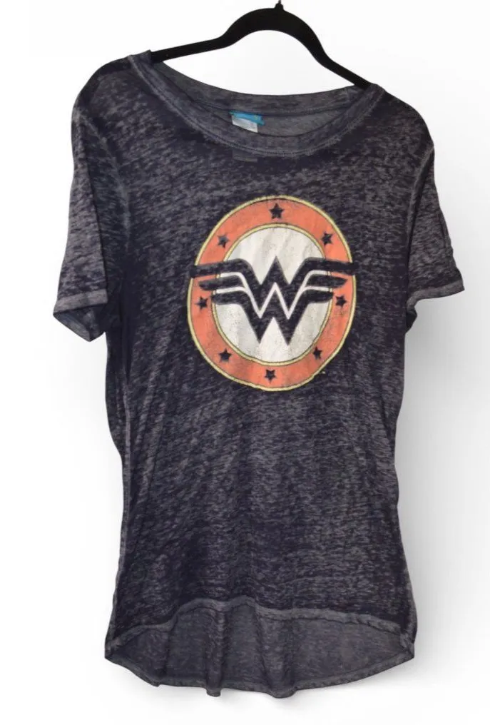 Wonder Woman Burnout T-Shirt Women’s Size L DC Comics Graphic Tee Show off your superhero style with this Wonder Woman burnout graphic T-shirt featuring the iconic logo in a distressed vintage-style print. Lightweight, semi-sheer burnout fabric gives it a soft, worn-in feel that’s perfect for casual wear. Details: Character: Wonder Woman (DC Comics) Size: Women’s Large (L) Color: Charcoal / Dark Gray Style: Graphic tee, short sleeve Neckline: Crew neck Fabric: Burnout blend (soft & lightweight) Fit: Relaxed / casual Condition: Very good pre-owned condition Great for fans of DC, comic books, superheroes, and casual everyday outfits. Easy to pair with jeans, shorts, or leggings. Ships fast.