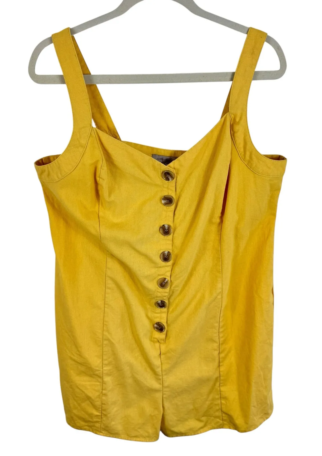 Excellent preowned condition. Yellow shorts/tank button front woven romper. Linen/polyester/rayon/co... Show more