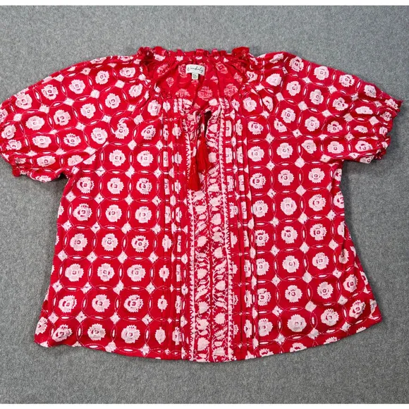 Size: PXL Condition: Good Pre-Owned Condition, Light Wash Wear. No Rips,Stains, or Tears.Please see all photos for most accurate representation of condition Color: Red/White Closure: Pullover with tie at neck Pockets: No Material: 100% Cotton